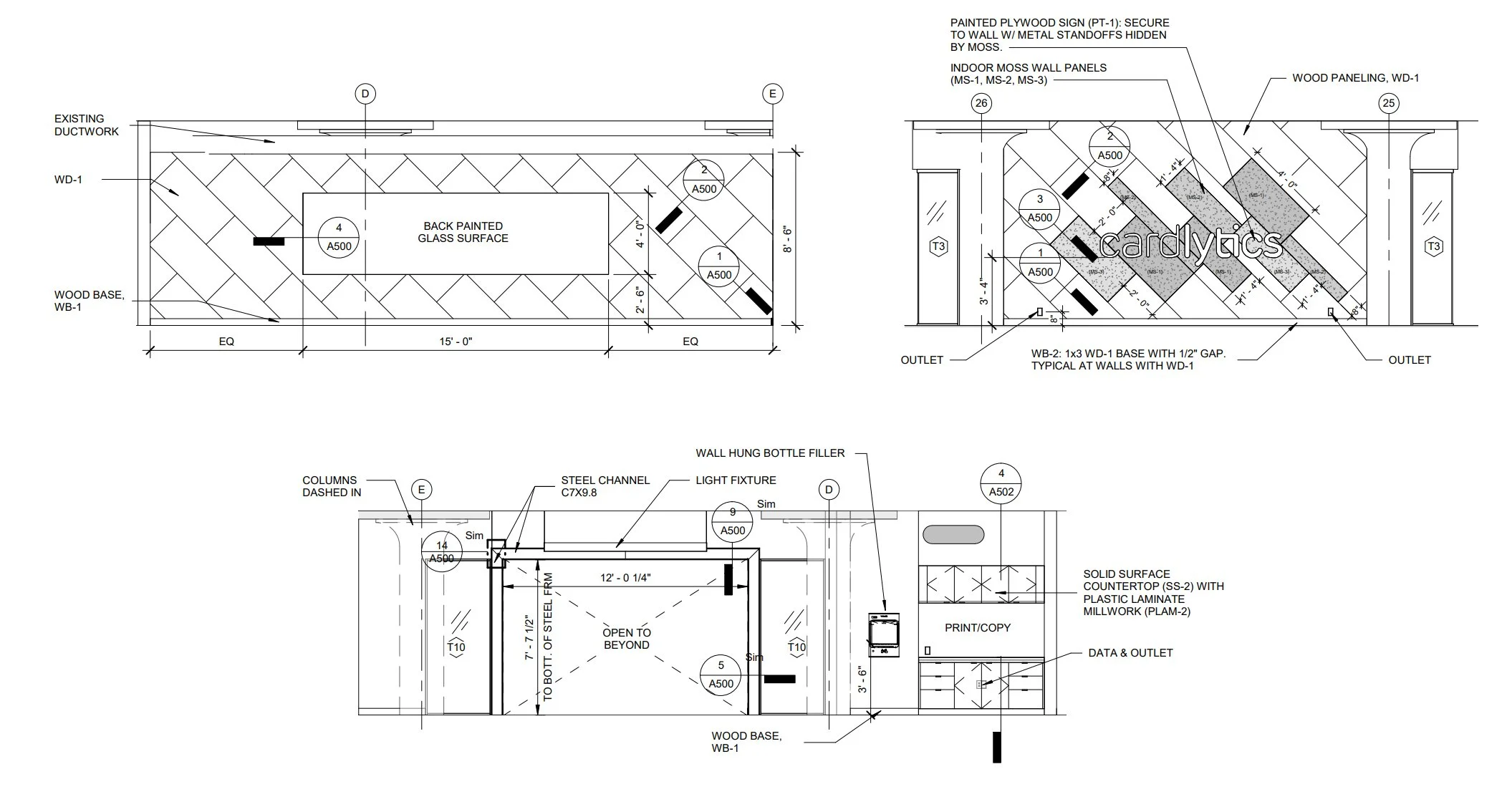 In keeping with the vibrant workplace desired by the client, this phase builds on the initial design language without replicating it, using the same material palette in a fresh way. Steel channels playfully frame the program and diagonal wall panels from Phase I were brought into Phase II to frame the inset moss wall. A lively palette of variously-colored moss was used to frame the office signage.